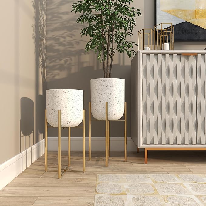 - WHITE AND GOLD FLOWER POTS FOR INDOOR PLANTS: Round plant pot set has a stunning white color with black speckles, polished finish, and gold colored stand