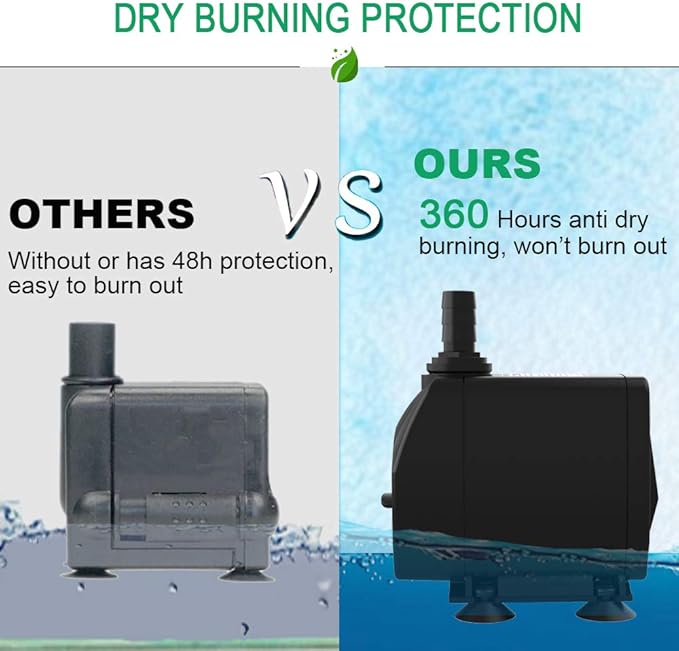 - 【DRY BURNNING PROTECTION】Considering that the users will forget to add water, we have added a temperature control protection switch inside the pump. When the pump is running-dry, it will automatically cut off the power when the temperature of pump is high,360-hour dry burnning protection,Don't worry that there is no water in your fountain, which will cause the pump to burn out.