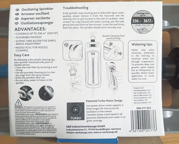 - 💧 Steady and Effective Irrigation: Equipped with 16 durable and powerful nozzles, the Primavera sprinkler delivers steady and effective irrigation to your lawn, plants, and garden. The included nozzle cleaning plug makes maintenance effortless, ensuring consistent performance.