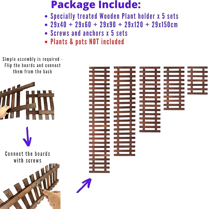 - 5 Pack: 29x40cmx1pc + 29x60cmx1pc + 29x90cmx1pc + 29x120cmx1pc + 29x150cmx1pc. Plants, flowers, pots, decorations are NOT included