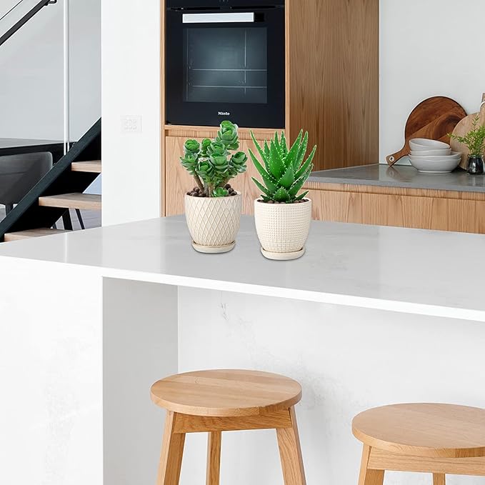 - 【4 inch Pots for Plants】:The shape of the ivory ceramic planters for indoor plants adopted a tapered design, carving 3 types different geometric patterns on each surface of the flowerpot, which makes it exquisite and special, it is fits for any home/office decor