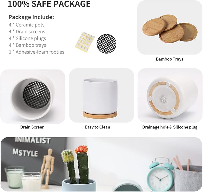 • Drainage Holes - The ceramic flower pots with drainage holes that allows excess water to flow out, thereby prolonging the life of the plant. The pots for plants with bamboo saucers really a great decoration for your desk. You can also use them without the saucers.