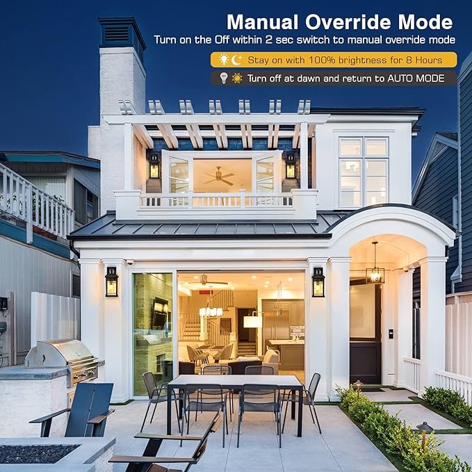 - ☀️【Unique Manual Override Mode】This modern exterior wall light fixtures could continuously be on 100% brightness at night, such as party scenes. To shift to manual mode from auto one and turn wall switch “off-on” with 0.5~2sec... In this mode, the wall lights fixture will turn on and keeping 100% brightness for approximately 8 hours but will auto turn off at dawn.