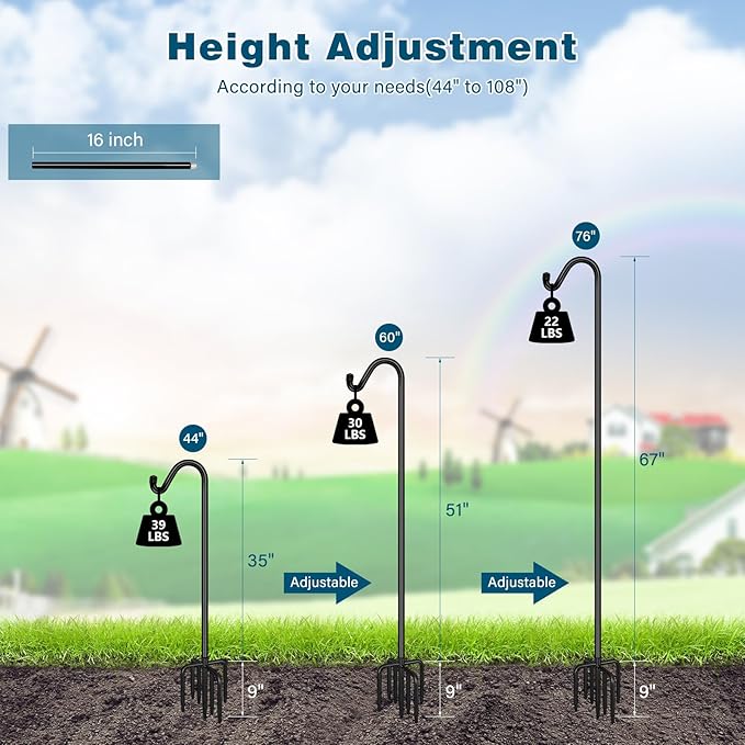 - 【HIGH QUALITY & ADJUSTABLE】 The height of the shepards hooks for outdoor is 76 inch and the diameter is 5/8 inch. Our garden hook is made of high quality iron, the black coating on the surface is rust resistant. The height of the shepherds hook for bird feeder can be adjusted by adding or reducing the pole sections, each pole section is 16 inch. So you can adjust the height to 60 inch and 44 inch.