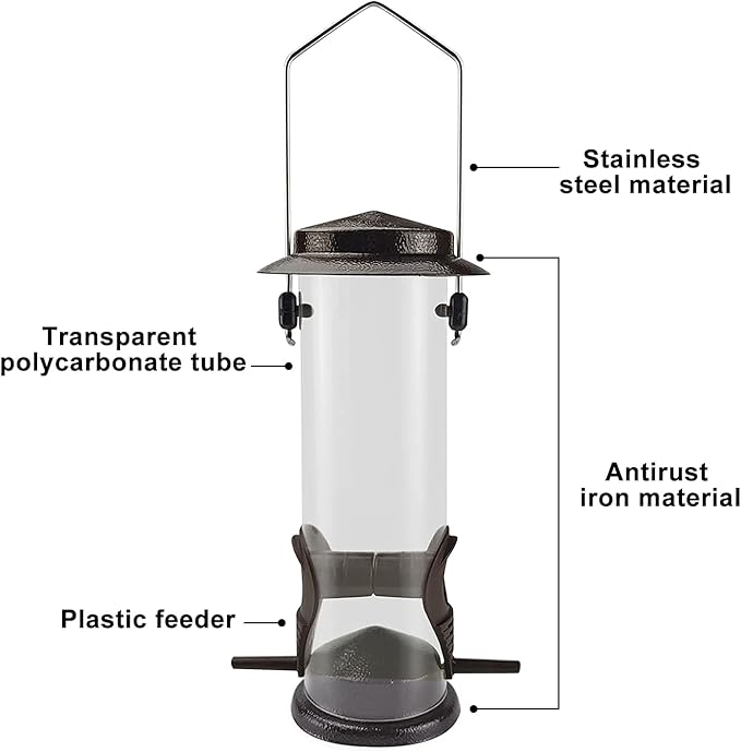 - WARRANTY & ENTERTAINING WILD BIRDFEEDER:Tube Bird feeder are superb gift idea for nature lover. Watch wild birds eating from this modern and elegant bird feeder and feel closer to nature with your family and friends. MIXXIDEA has offered customers premium metal bird seed feeders for many years. If you have any questions, please contact us in time, we will give you a solution within 24 hours. The quality of product is up to the mark and customer satisfaction is our achievement