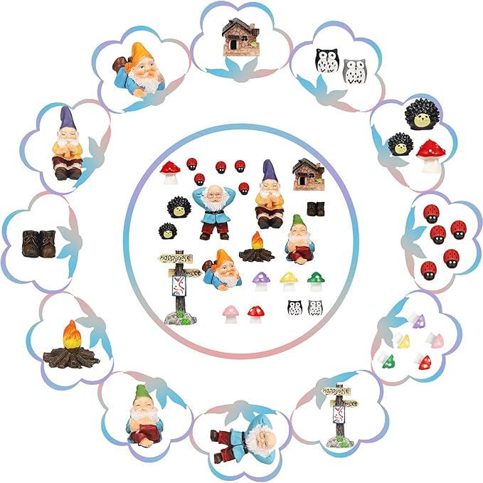 - Different size of gnome statues: you will receive a full set of gnome fairy resin statues, including 1 piece reclining gnome (2 x 1.6 x 0.6 inches), 1 piece crawling gnome (2.2 x 1 x 1.1 inches), 1 piece sitting gnome with its shoes off (2 x 1 x 1.4 inches), 1 piece sitting gnome in shoes (1.9 x 0.9 x 1.8 inches), 1 pair of shoes (0.6 x 0.7 x 0.5 inches) and 1 piece fire statue (1.4 x 1.4 x 1.2 inches
