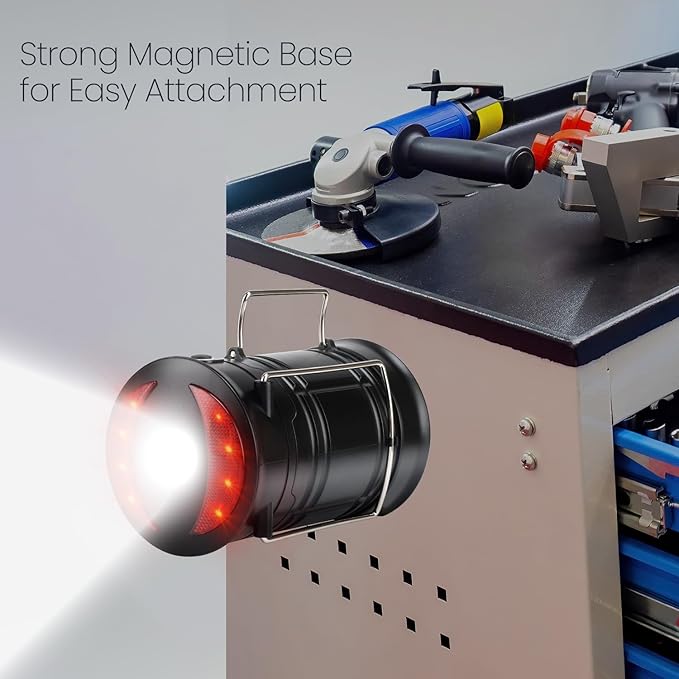 - COMPACT & COLLAPSIBLE: Foldaway handles for suspension, collapses for storage; No switches: pull up handles for brightness control; 2-in-1 flashlight and lantern, hangs easily; 3 strong magnets for hands-free metal attachment