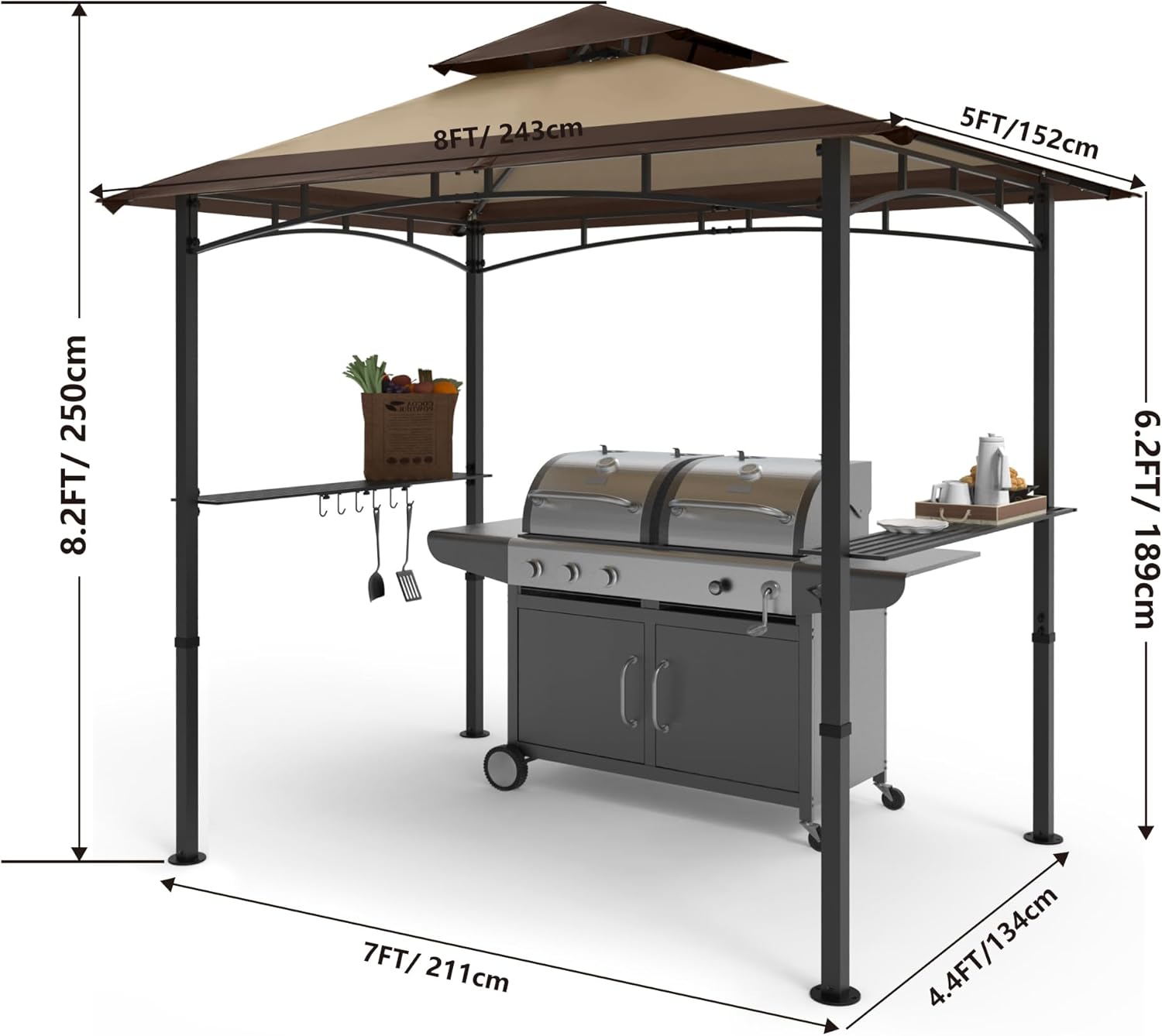 COOSHADE 8'x 5' Grill Gazebo Double Tiered Outdoor BBQ Gazebo Canopy with LED Light (Brown with Khaki)