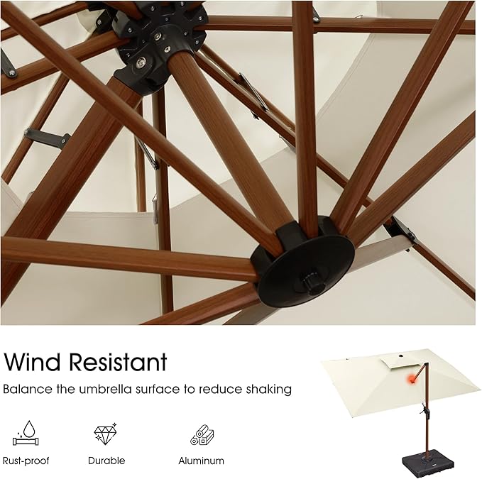PURPLE LEAF 9' X 12' Double Top Deluxe Wood Pattern Rectangle Patio Umbrella with Base Offset Hanging Umbrella Outdoor Market Umbrella Garden Umbrella, Cream