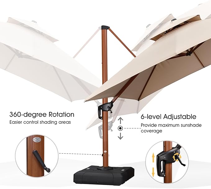 - Large area shade: The size of this patio umbrella is 10'X10', unique handle design and crank system, 6 height and angle to choose, 360 degree rotation for easier shading area control