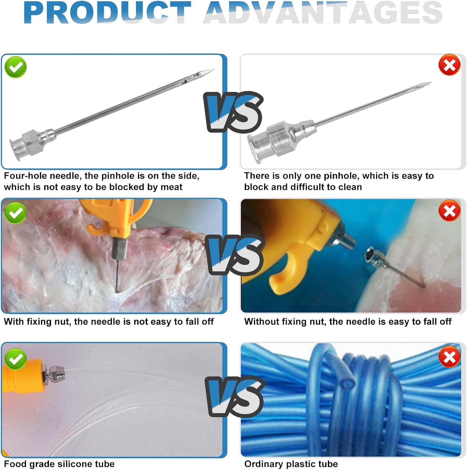 - [Package includes]: 1x Meat injector gun, 1x Food grade silicone tube, 1x host, 1x Filter screen, 10x Needle, 1x Power supply, 1x User manual
