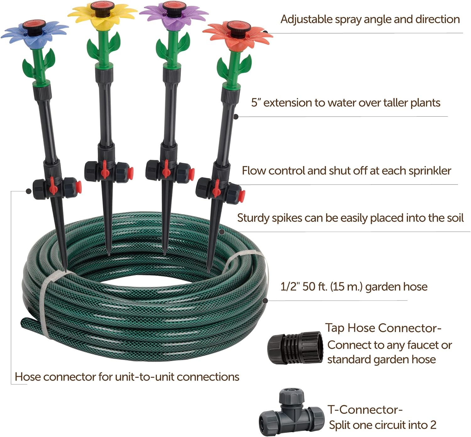 • Set includes (4) adjustable sprinklers, (1) 3-way hose connector, (1) hose connector, (4) extensions (increase the height by 5 inches), and (1) 50 ft. ½” standard hose.