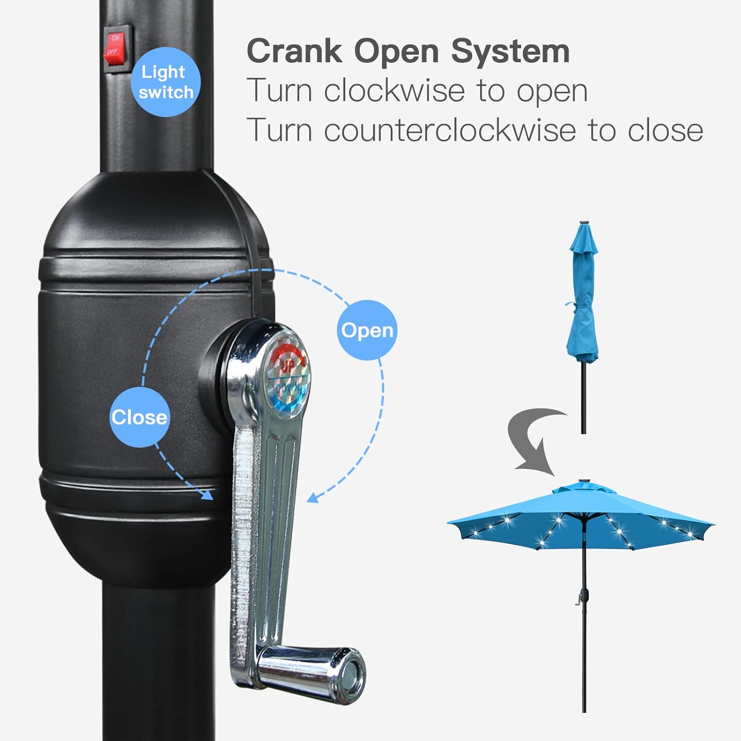 - Convenient crank opens/closes system and handy push button tilt, even easy to use for kids and the elderly. Keep the sun at the back in the daytime.