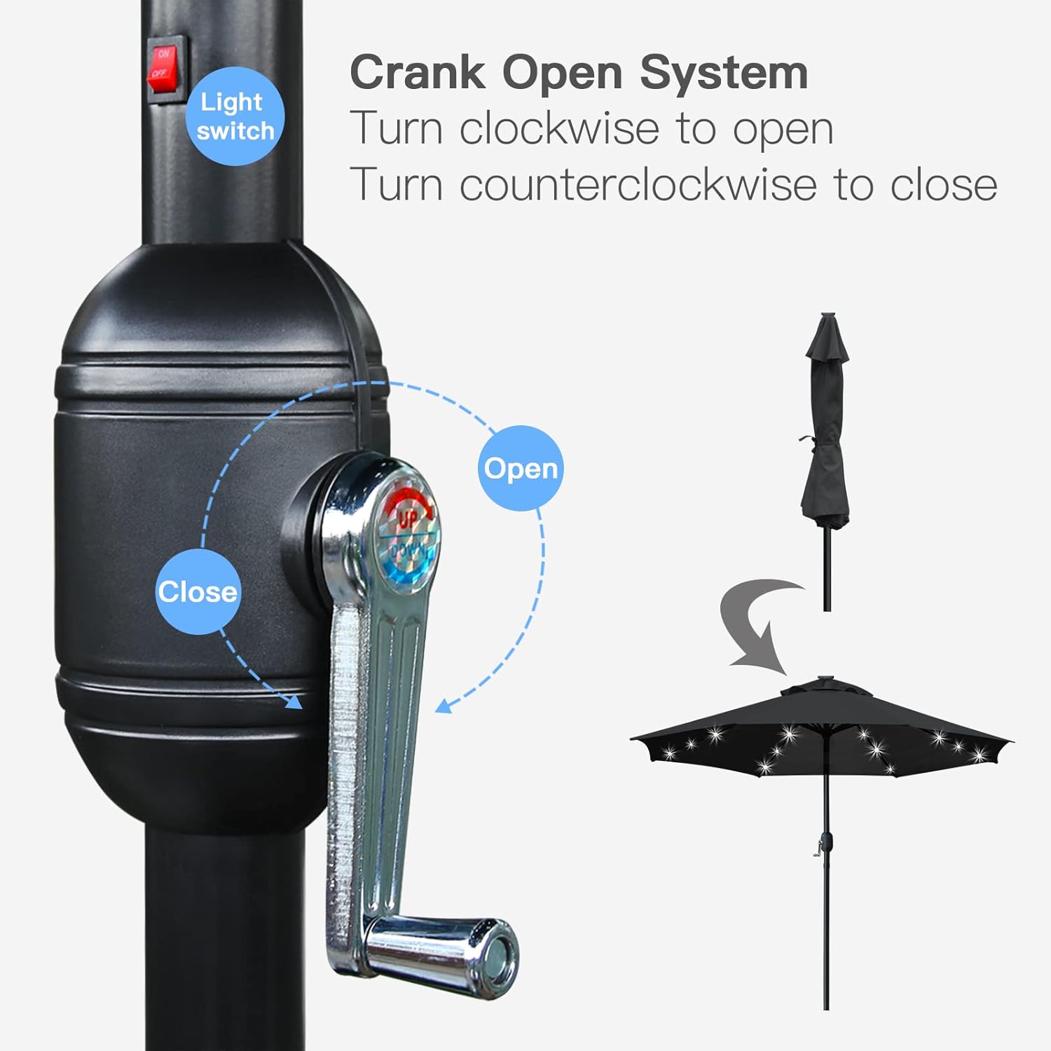 Sunnyglade 9' Solar LED Lighted Patio Umbrella with 8 Ribs/Tilt Adjustment and Crank Lift System (Black)