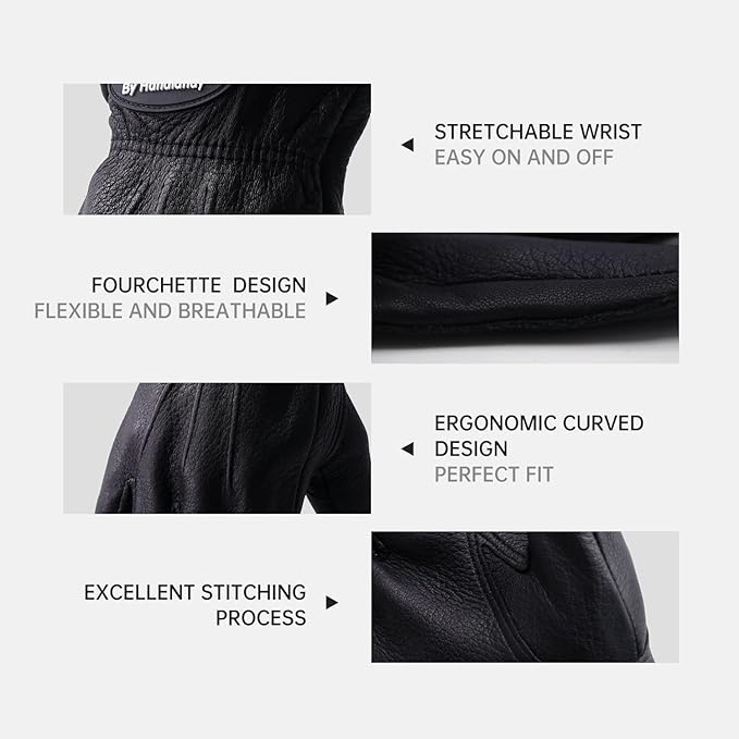 • Deerskin Leather Work Gloves - North American original genuine deerskin leather, nature tanning, comfortable and durable. High quality thick deerskin material, superior abrasion and puncture resistance, protect your hands from cuts and scratches