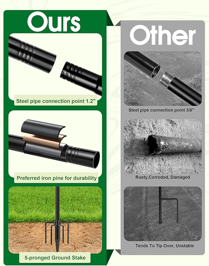 - 【Sturdy Design】 Made out of black metal for a sturdy design, 4 piece collapsible pole for easy storage. Upgraded with 4 extra long and double-forked base prongs to be total 5 prongs which makes it the strongest garden flagpole in the market and maintain a fixed, upright posture while remaining firmly planted in the ground without easily falling down.