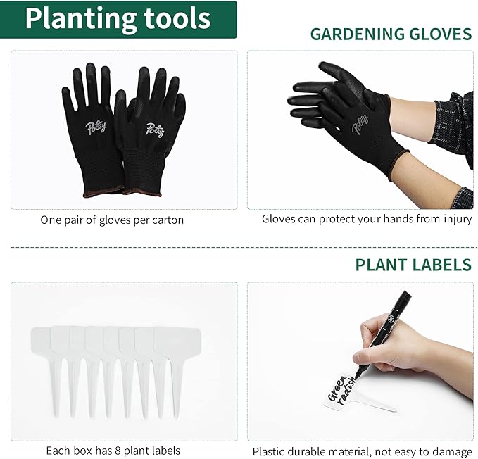 • Complete Set: Includes 2 black fabric covers, gardening gloves, and 8 plastic plant labels for organization and protection