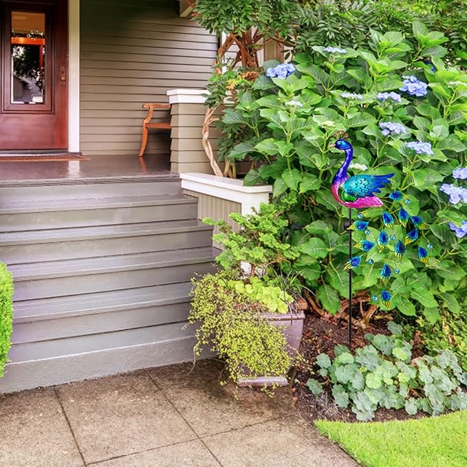 - Beautiful Peacock Garden Decor: Elegant peacock solar stake lights made your garden more lively and Vividly. This lawn ornament features with green crackle glass ball that brings a sense of magic. Whether day or night, it's a great decoration to porch, court, yard, garden, walkway, pathway, driveway, grave, lawn or pool