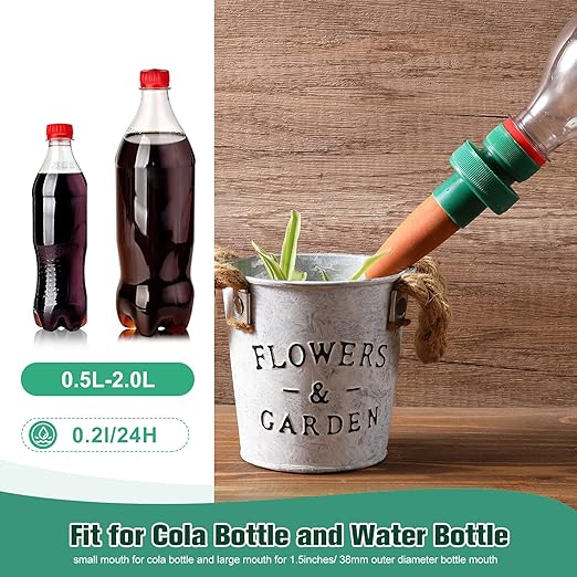 - Effortless to Install: foremost, soak this bottle adapter in water for about 15 minutes, and then use standard water bottle and fill it with water, screw this bottle adapter onto the bottle, poke a small hole to let a bit of air in as it drains, finally, push this stake with bottle into soil near the plant