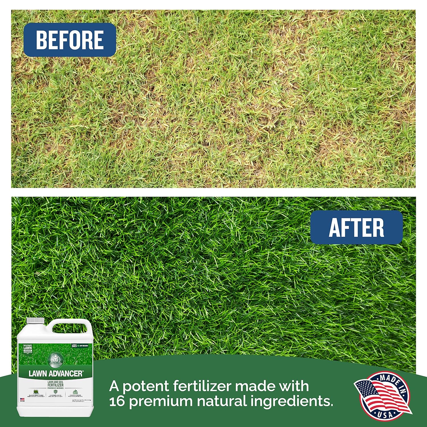 - Effortless Application: Our grass fertilizer for lawn simplifies lawn care routine with its user-friendly design and liquid formula. Mix 4 oz. of the Lawn Advancer per gallon of water, shake, apply, and witness the transformation of the grass. Apply every 4-6 weeks to provide energy, nutrients and stress relief to your lawn and soi