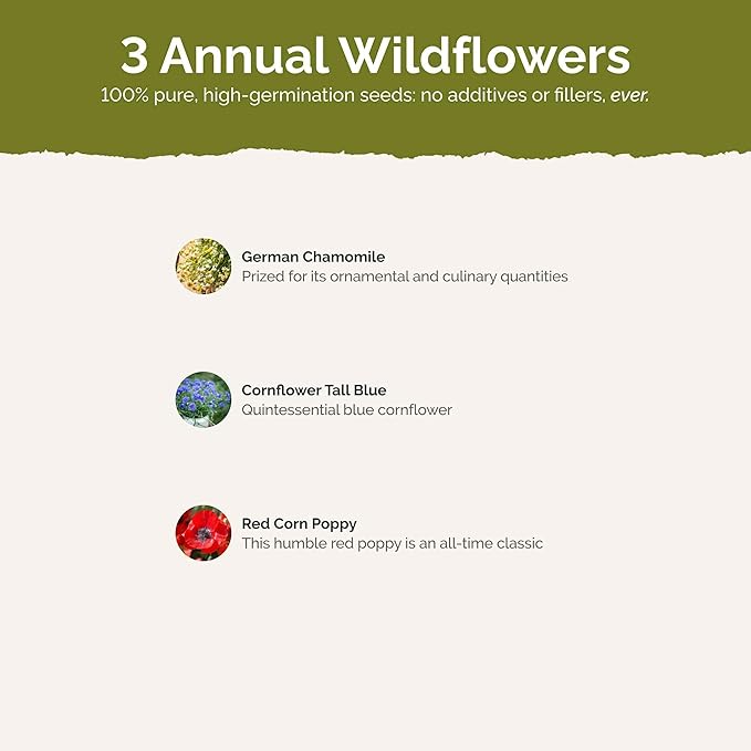 - 100% Pure, Non-GMO Seeds - No fillers, favorites only! Includes 3 easy-to-grow species: German Chamomile, Cornflower and more