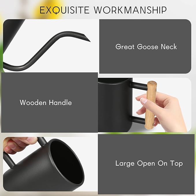 - [COMFORTABLE WOODEN HANDLE] The indoor watering can has a round comfortable wooden handle that is easy to grasp and won't cut your hands.This stainless steel watering can open built-in open top design, it is convenient to refill water