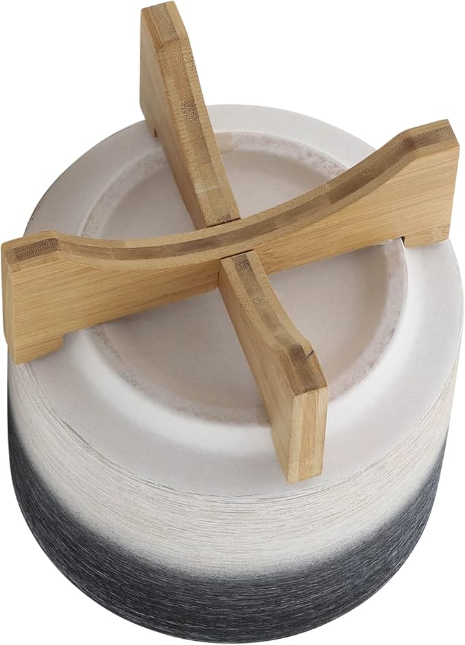 - This ceramic decor features a circular planter in gray and white with a unique textured gradient design. It sits on top of a simple brown wooden stand.