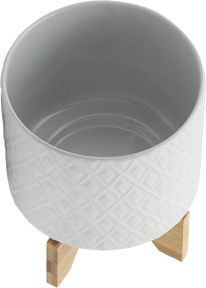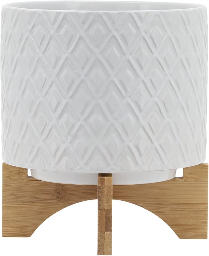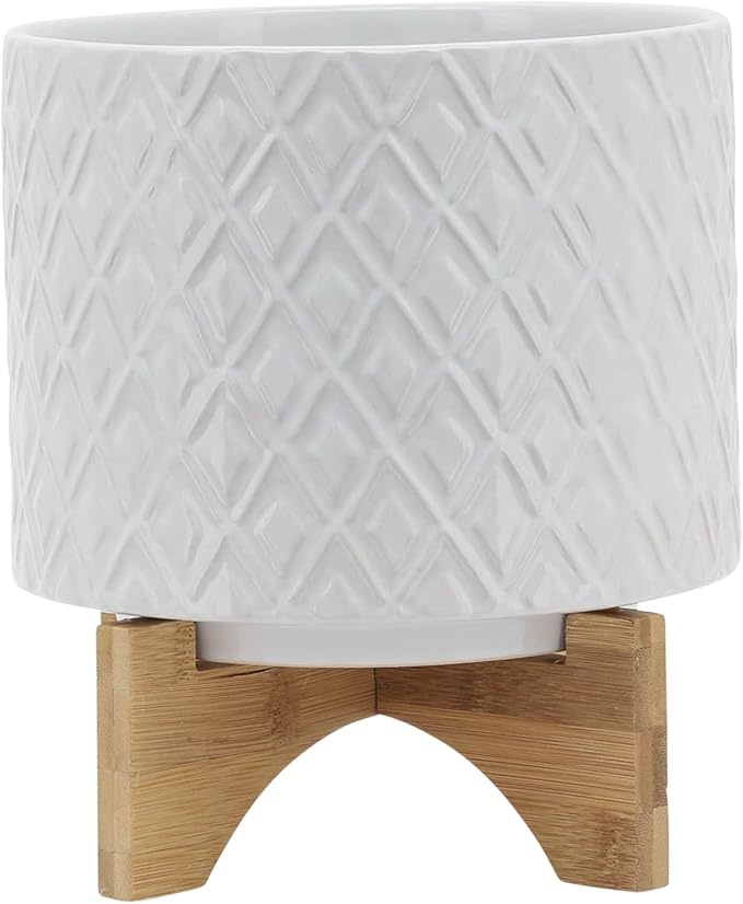 8" Ceramic Planter Stand, White Diamond Design with Wooden Base, Indoor/Outdoor Planter with Stand for Your Succulents and Small Plants