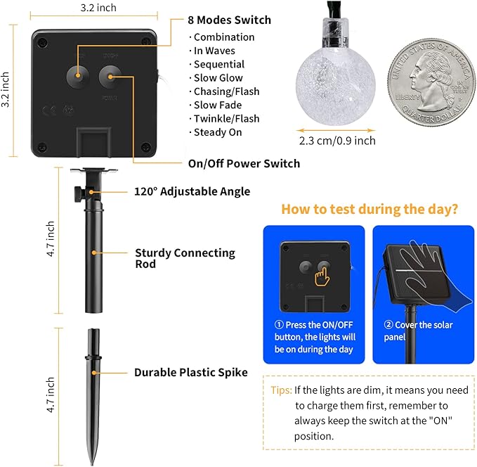 - 【Solar Powered & Auto On/Off】2-Pack total 72ft 120 LED string lights, solar energy supply, adjustable monocrystalline silicon solar panel with better conversion rate of energy, no need to replace the battery or extra utility electric cost; Light sensor controls the solar globe lights auto on at dark and auto off at daytime.