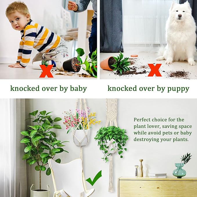 - 【Easy Installation Macrame Plant Hanger】Our macrame plant hanger come with 7pcs S hooks and 7pcs ceiling hooks, easy to screw in ceiling or hanging on curtain rack.The plant hanger is suitable for indoor and outdoor use. These hanging macrame planters are easy to use, just expand the 4 legs, put the flowerpot into the bottom middle.This plant hanger will fit a variety of flower pot shapes and sizes.Our plant hangers indoor macrame can keep your plants safe from curious toddlers and pets.