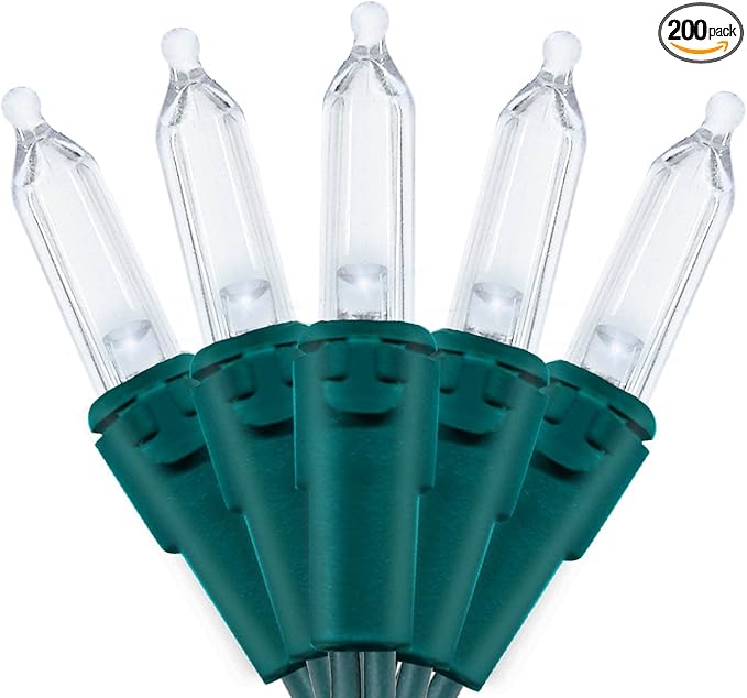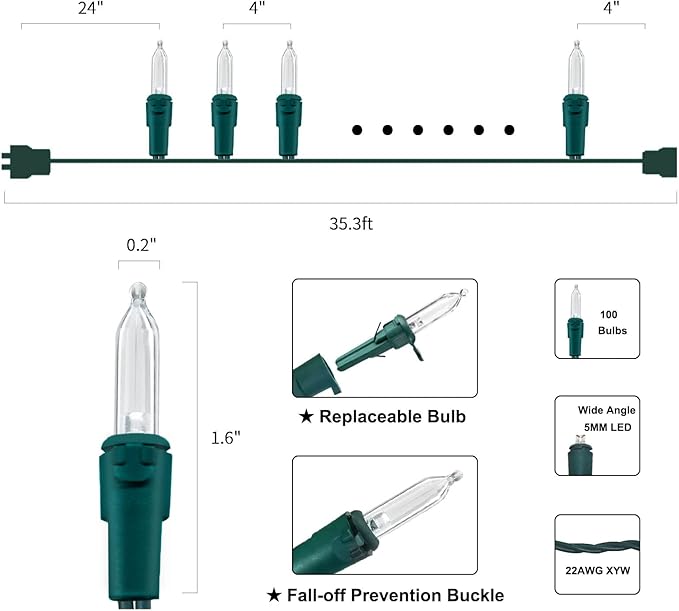 - 【Mini LED Christmas Lights Specification】: 2 Sets - green wire christmas string lights includes 100 count cool white led lights, total length 35.3ft, lights length 33ft and each led is 4 inches apart, 24 inches lead wire, 4 inches end connector (Extra 2 x replacement bulbs and 2 x fuse included)