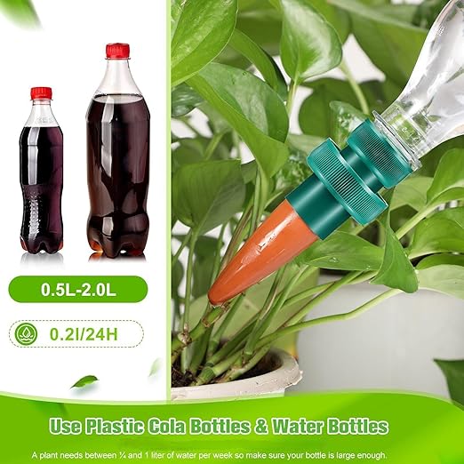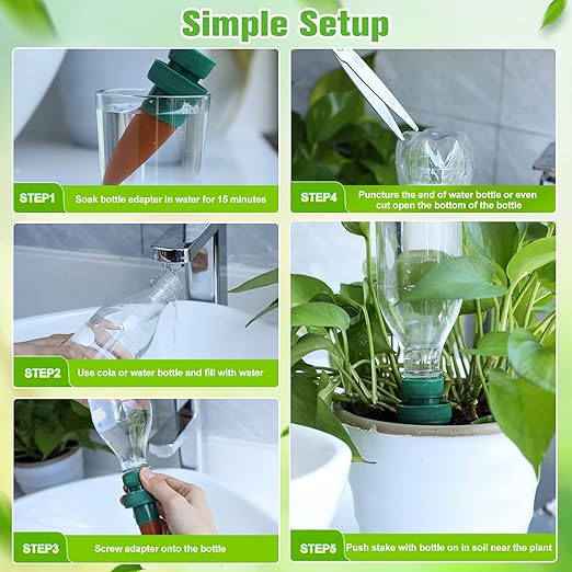 - Effortless to Install: foremost, soak this bottle adapter in water for about 15 minutes, and then use standard water bottle and fill it with water, screw this bottle adapter onto the bottle, poke a small hole to let a bit of air in as it drains, finally, push this stake with bottle into soil near the plant