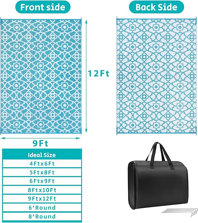 - Versatile Outdoor Carpet: The indoor outdoor plastic rugs have multiple choice in different colors(4'x6',5'x8',6'x9',8'x10',9'x12',9'x18',8'round), is ideal for a variety of indoor outdoor activities,like patio mat, deck rug, garden rug, beach mat, picnic mat, BBQ party mat, rv camping rug,pool rug,outdoor doormat,garage rug,front door mat,allowing you to have plenty of imaginable space for more fun.