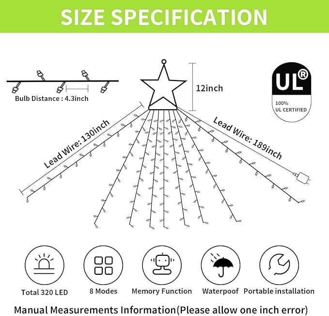 - 【320 LED Christmas Lights】Christmas decorations lights are made with super bright 320 LEDs, consisting of 9 string lights of 32 led each. The top star diameter is 12.6in. Each string drops 11.5ft. The plug cable length is 16.4ft. Light up your house or yard, bringing you into a fairy world with starry lights, creating a cozy and festival mood for your home.