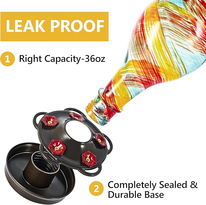 • LEAK PROOF: This vintage glass hummingbird feeder features a convenient 36 fluid ounces capacity, a slender shape and a completely sealed base that has the least leaking, drips and spills