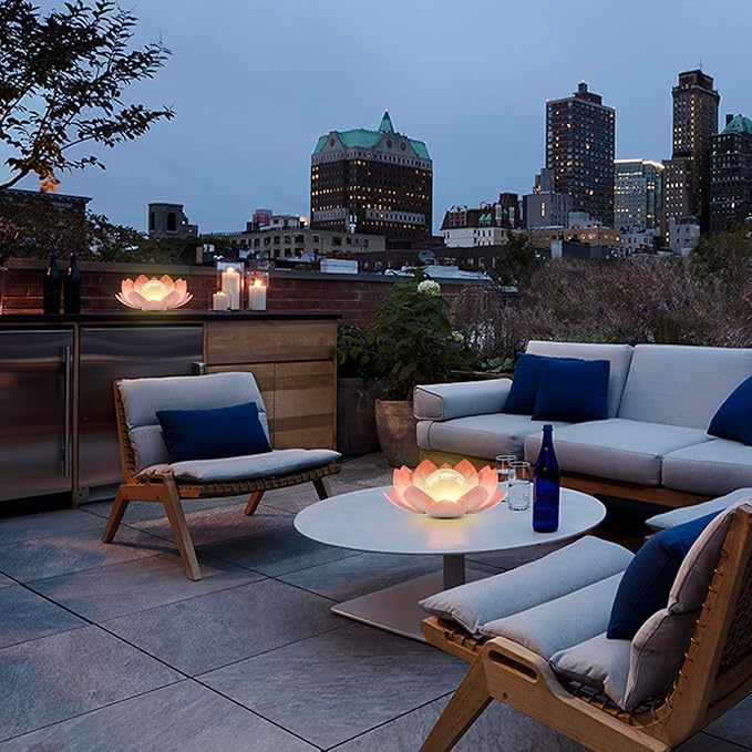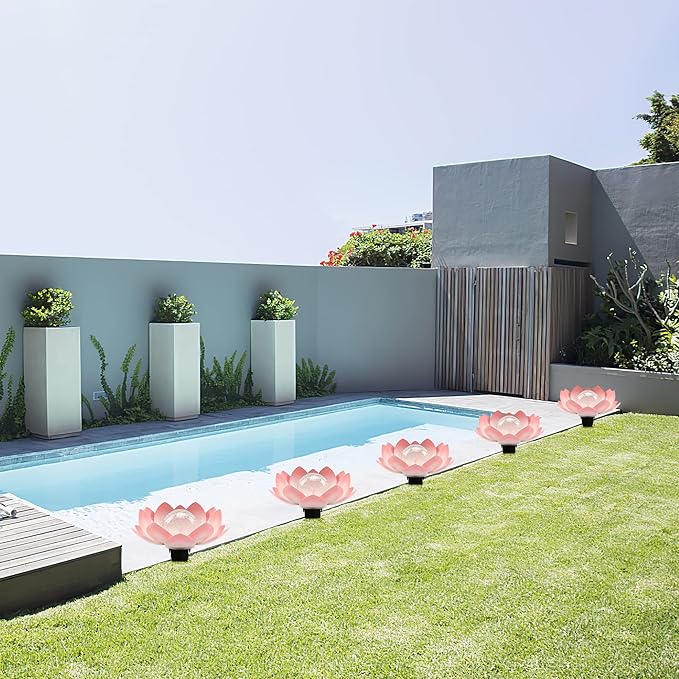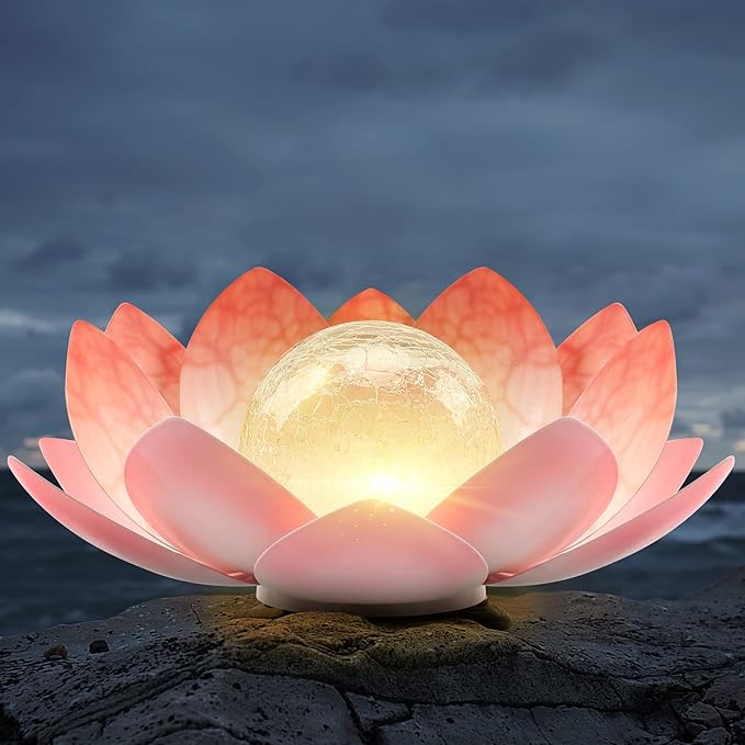 - Pink Lotus flower type solar garden lights outdoor present unique visual pleasure with flower petal and cracked glass globe design. Emitting soft, gorgeous amber light, solar lotus flower lights illuminate in a water ripple pattern on the wall and the floor. The lotus lamp will create a romantic atmosphere to your home and garden.
