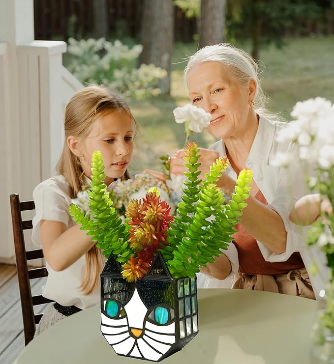 - MUITIFUNCTIONAL USE:Looking for a unique and beautiful way to display your plants; Tiffany's Cute Cat Stained Glass Planter; Made with a corrosion resistant pure copper frame;these planters are not only functional but also beautiful;Each planter is handcrafted and can be used for planting;dried flower arrangements;candle holders;pen or makeup brush holders;and more;Perfect for decorating your dining table;living room;or anywhere else you want to add whimsy and charm