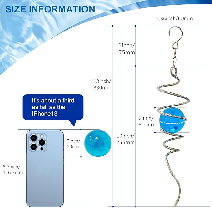 - 【 Enjoy Magic Visual Illusion 】This beautifully clever yet simple gazing ball spiral tail is designed to create a stunning optical illusion. The glass ball appears to float and dance in the air as the magic glass ball spiral tail spins, creating a magical visual illusion that has a calming and relaxing effect on the mind. The Spiral Tail Wind Spinners can reduce anxiety and improve mental focus, making it perfect for creating a relaxing atmosphere in your home, garden or yard.