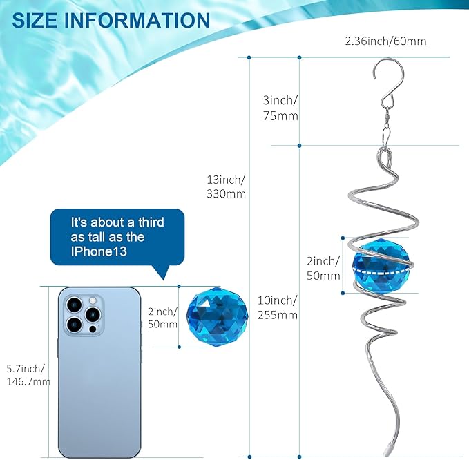 - 【 Cleverly Designed Spiral Tail 】When the Gazing Ball Spiral Tail spins, it has a magical hypnotic kind of effect. This crystal ball gives the illusion of moving up or down on a spiral tail. Gazing Ball Spiral is also a special crystal sun catcher rainbow maker. This spiral tail suncatcher captures rays of light, creating a cheerful light-scattering effect. Perfect for creating a relaxing atmosphere in your home, garden, patio or yard.