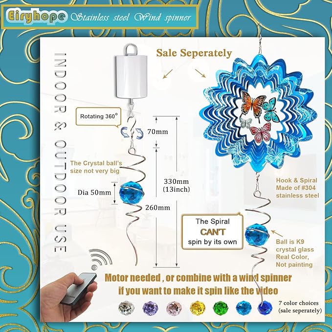 - 【 3D Wind Spinners Stabilizer 】The wind spinner spiral with a 360° swivel hook is easy to hang. Our wind spinner crystal tails are gorgeous additions to our range of 3D wind spinner accessories. Attached to the bottom of kinetic wind spinner, which adds another dimension to the overall look, also helps provide stability on windy days. Since the Wind Spinner Stabilizer Spiral Tail can't spin on its own, add a wind spinner motor (not included) to help it spin.