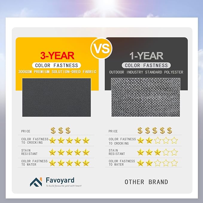 - 3-year Color Fastness - Our patio chair cushions adopt 300GSM High Density polyester fabric, thanks to the superb coloring technology, we proudly say the fading resistant is 20 times that of ordinary products, Favoyard outdoor seat cushion for patio furniture is a perfect decor in garden, patio, beach and etc.