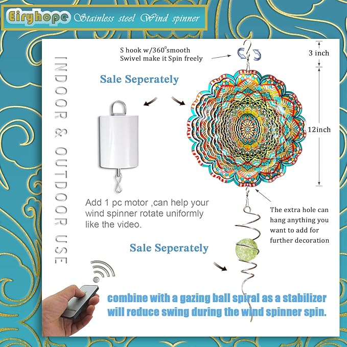 - 【 Easy to Use 3D Wind Spinner 】The garden wind spinner is easy to shape and spin. Its 3D design makes it easy to transform into a 3D hanging wind sculpture. This mandala wind spinner's ingenious metal construction catches more breezes to spin. The 12 inch wind spinner is an eye-catching focal point.