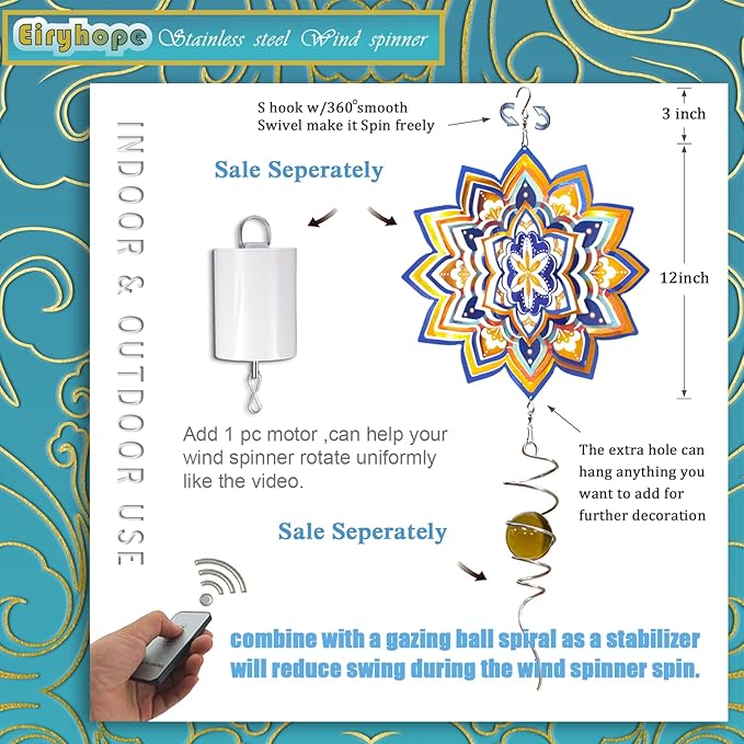 - 【 Easy to Use 3D Wind Spinner 】The outdoor wind spinner is easy to shape and spin. Its 3D design makes it easy to transform into a 3D wind sculpture. The ingenious metal construction of this mandala 3D wind spinner catches more breezes to spin. The 12" wind spinner is an eye-catching focal point.