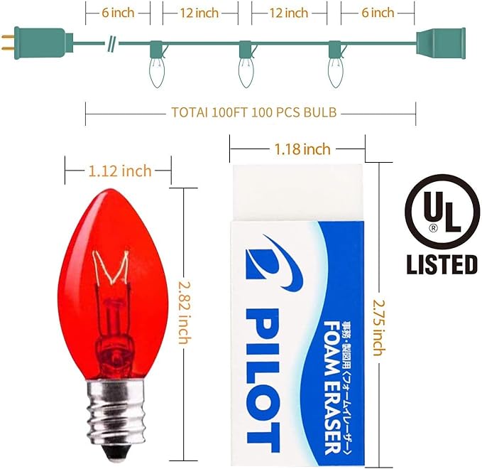 • Christmas string light, 100pc C7 multicolor bulbs, 6" lead with male plug, 12" spacing between bulbs, 6" tail with female connector. Lighted Length 99 Feet, total Length 100 Feet. Not connectable
