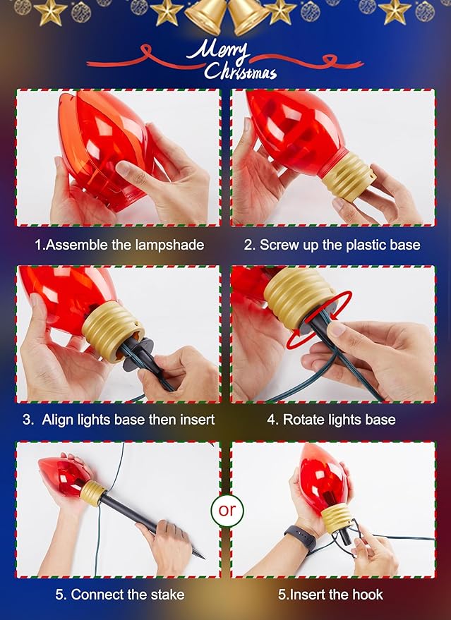 - Replaceable: Turn the yard Christmas lights support on the base and pull out the internal light bulb from the outer jumbo C9 bulb, screw out the damaged bulb from the bulb holder, then screw in a new one gently. Slide out the fuse chamber cover toward two blades and take out the burnt-out one, install the new one correctly and close the cover
