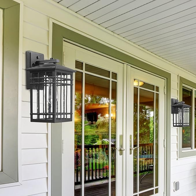 • ✔ COMTEMPERARY DESIGN--This dusk to dawn wall lantern is in black finish metal construction with seeded glass shade provides a beautiful lighting for entryway, doorway, foyer, corridor, balcony, patio and porch. It is Auto on at dusk, auto off at dawn, saves energy for you, which is ideal for installing in both farmhouse or modern building fixture.
