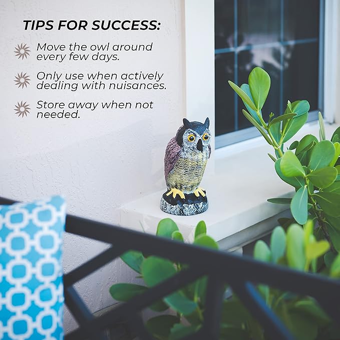 • MULTI USE - Place it in your garden or farmland as an owl statue or to protect your crops of fruits, vegetables, & plants. Widely used in orchards, gardens, barns, front lawns & trees. Keep your windows, boats or cars clean from bird droppings