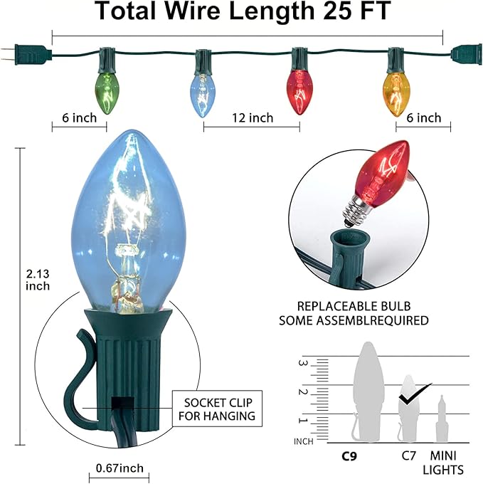 - [Retro Christmas Lights] C7 outdoor string lights bulbs is made of high quality clear glass, waterproof and durable, outdoor christmas decorations lights perfect for decorating your home, Christmas, holidays, winter, store, backyard, garden, patio, wall, gate, yard, Christmas tree, window, party and before Christmas for every occasion.