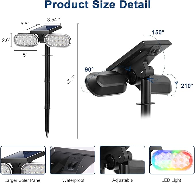 - 🌈【Double Heads 210° Adjustable】 Double heads design of our solar colored landscape spot lights, the lighting area is larger, 210°adjustable no wires to run multicolored solar spotlight, Zero electricity bill.