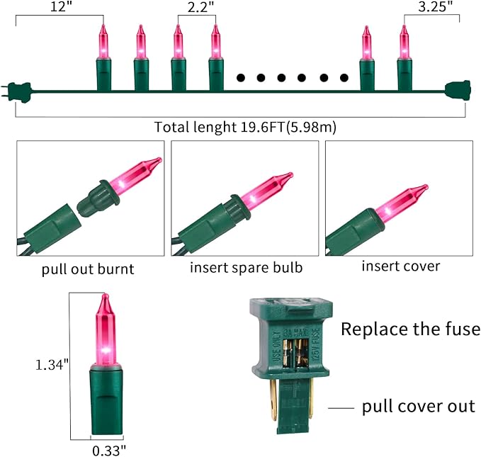 - 【Green Wire Christmas String Lights Decoration】:100L traditional incandescent Christmas light set,19.6Feet Pink Christmas Mini String Lights,each set include 4 Extra Bulbs & 2 Replacement Fuses.Perfect for indoor and outdoor decoration.Plug in,put it where you want,watch and enjoy this light.The light can be reused for many years.